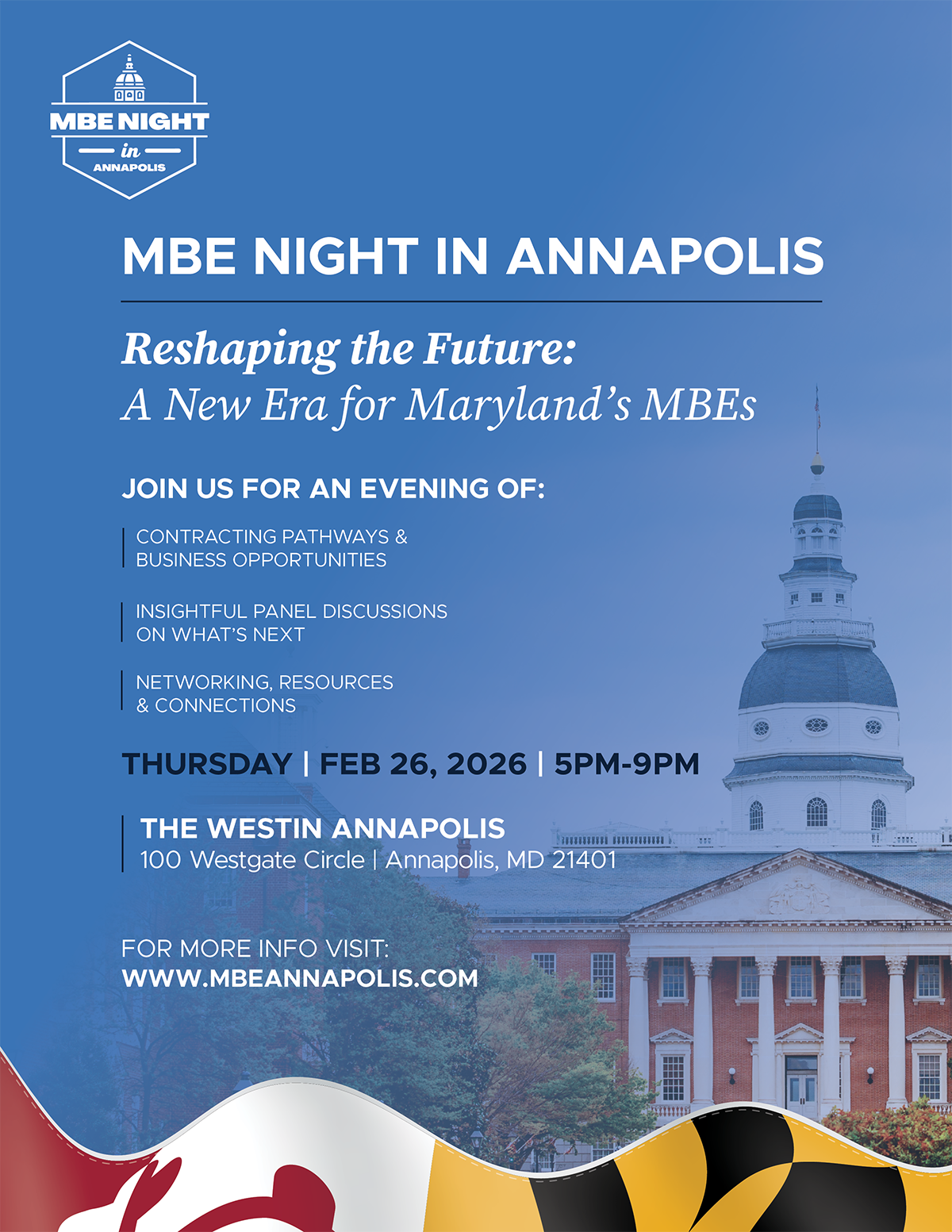 MBE Night in Annapolis is an independently organized outreach and networking event focused on education, business development, and increasing access to existing procurement opportunities for small and minority-owned businesses. This event is not intended to influence legislative or executive action, nor does it include advocacy for changes to policy, law, or regulation. Participation by public officials is voluntary and for informational purposes only.